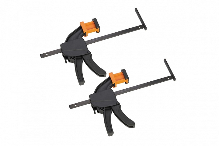 Пара быстрозажимных струбцин для крепления направляющей к заготовке. Для пил Triton TTS1400. Каждая струбцина занимает по 25 мм длины направляющей.