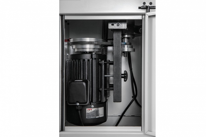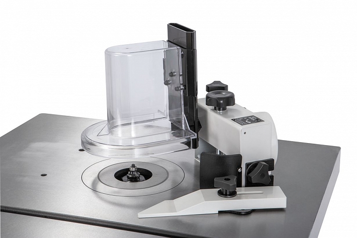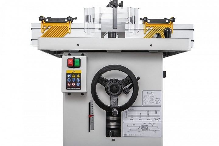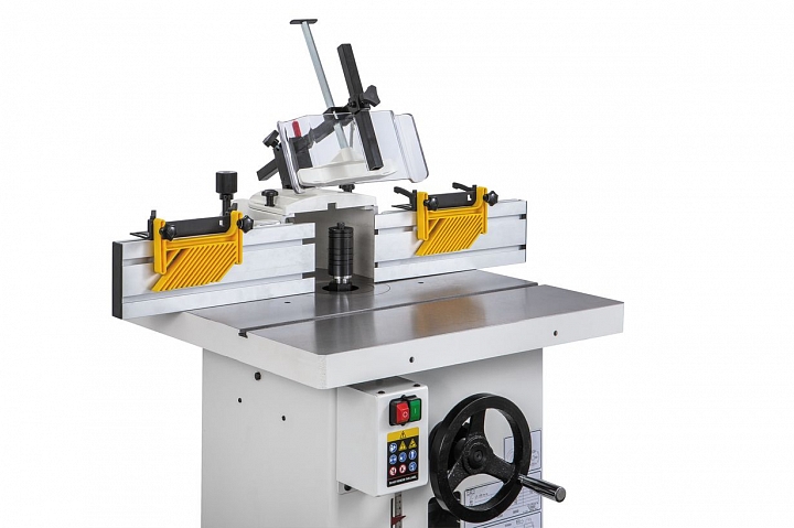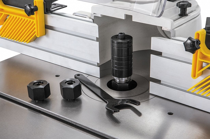 У станка сменный шпиндель, который фиксируются на валу гайкой и шомполом. Штатно установлен 30-миллиметровый для насадных фрез, для концевых в комплекте поставляются цанговые зажимы 8 мм, 12 мм и 1/2 дюйма. Для удобства смены оснастки предусмотрена блокировка вращения вала; в целях безопасности и защиты оборудования установлен концевик, не позволяющий запустить мотор, пока блокировка не снята. Четыре скорости вращения меняют переустановкой поликлинового ремня. В сравнении с предшествующей моделью передаточный ряд «смещен вверх» в сторону больших оборотов.