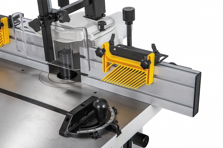 Основные базовые детали станка – тяжелый чугунный стол и фрезерный упор из алюминиевого литья. Теперь этот узел унифицирован с более дорогой моделью, он оснащен алюминиевыми, а не деревянными накладками и имеет прижимы-гребенки, дополняющие вертикальный упор. Увеличен диапазон перемещения упора по столу. Как и прежде, есть отдельная регулировка положения приемного (заднего) башмака.