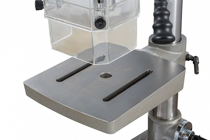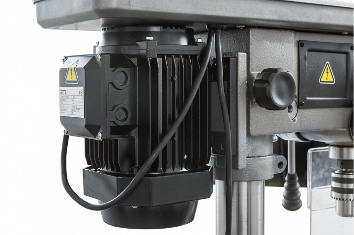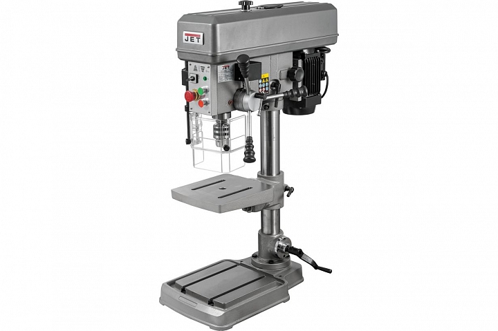 Станок сверлильный настольный IDTP-16 возглавил новую линейку станков JET с возможностью нарезать резьбу. Данный станок производится в Китае, что позволяет снизить стоимость изготовления, а это непосредственно влияет на цену станка в России. Станок оснащен мощным двигателем 500Вт и способен в режиме долгих нагрузок нарезать резьбу до М12. На станке установлен асинхронный двигатель, на который установлен шкив с 5-я ручьями, перекидывая ремень по ручьям шкива, вы меняете скорость от 200 до 2350 оборотов в минуту. Данное решение в тандеме с легкой натяжкой двигателя и надежной фиксацией, позволяет сохранить и передать хороший момент на шпинделе. Основание станка отлито из серого чугуна, станок устанавливается на верстак или стол, подстолье и фиксируется болтами. Надежная фиксация позволяет уменьшить вибрации. В основание вставляется толстостенная труба, на которую непосредственно крепится голова сверлильного станка. В управление станок достаточно прост.